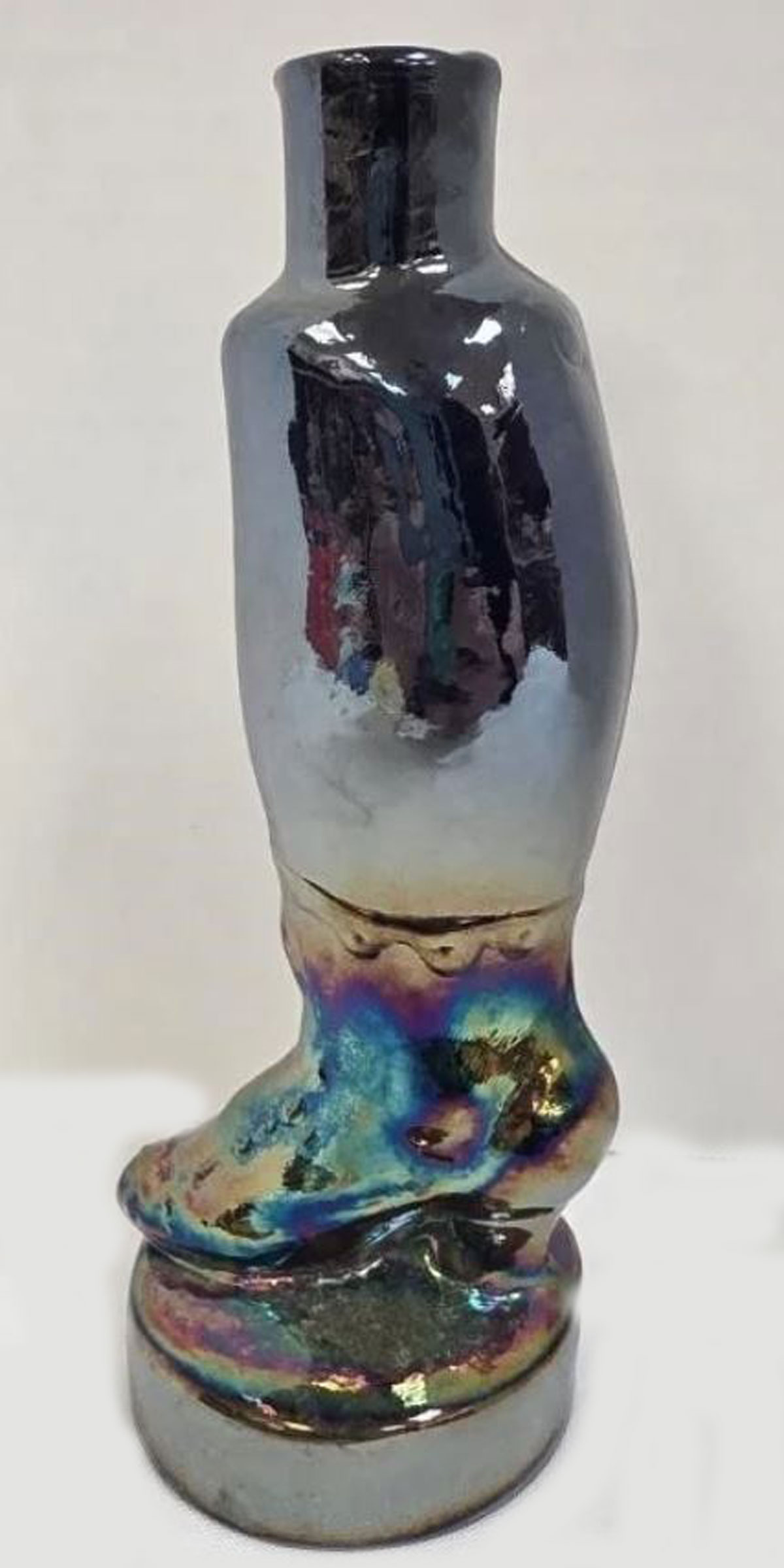 To the far left is ia figural bottle in the shape of a boot. It is 7 1/2 inches tall. Also to the left is a figural bottle in the shape of a potbelly stove. It is five inches tall. The bottom is marked "Ci" for Lester Cunningham along with 1972 and a small triangle. Another figural bottle is an insulator. For more information on Big Pine Key Glass Works see, Lloyd Reichel's book entitled "Modern Carnival Glass Collectors Book II" pages 69 & 70 and 75 & 76. Encore Book 2 pages 62 and 103. |