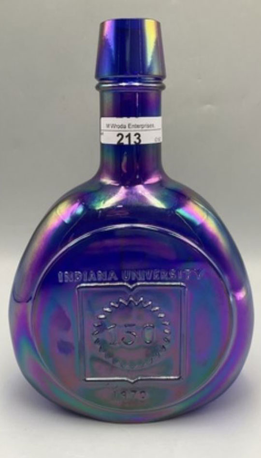 The above bottle was made for the Indiana State University in 1970 to celebrate its 150th anniversary. The front of the bottle reads "Indiana University 150 1970." And the back of the bottle has a university building." |