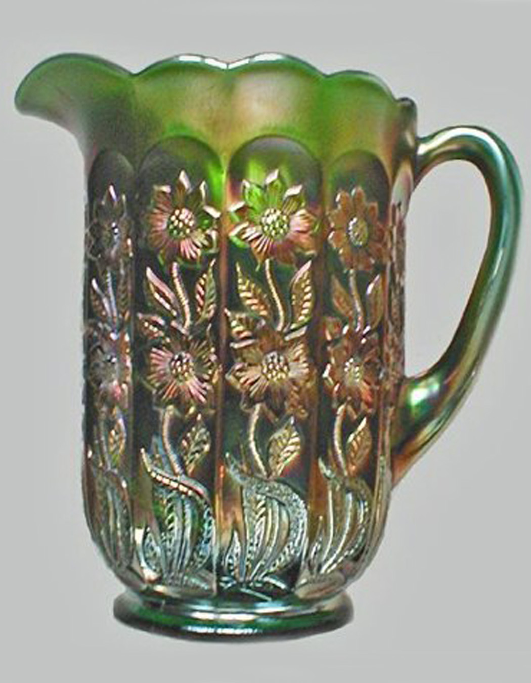 This pattern is by Fenton and only comes in an 8 1/2 inch tall pitcher. No tumblers are known to match the pitcher. The pitcher sits on a collar base and has a scalloped top. Vertical panels encircle the exterior of the pieces and within each panel are stemmed flowers and leaves. The handle is molded into the pitchers.