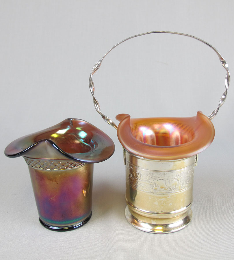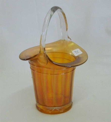 The pieces have collar bases and 12 vertical interior panels. The typical hat shape has two sides pulled up at the top. This allows the piece to sit in a metal holder with a handle thus creating a basket. Metal holders can vary in design and were probably not made at the Diamond factory. Sometimes Band pieces are found with a glass handle that has been applied. These true baskets eliminate the need for a metal holder. |