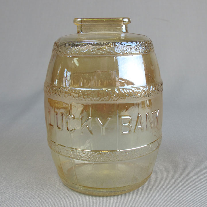 ![]() Lucky Bank - Shaped like a wooden barrel, this bank says "Lucky Bank" on the front and on the back. It is 4 inches tall and only found in marigold. The bottom says "Patent Applied For". |