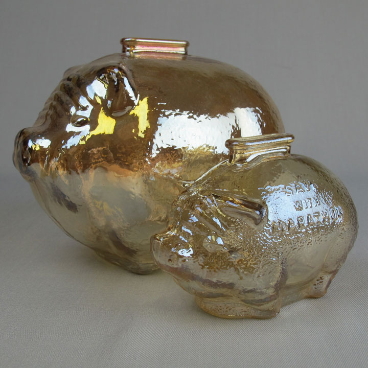 Depression era carnival glass banks were made beginning with the onset of the Great Depression and continued into the 1950s. During World War II very little glass was made. These banks were made to teach young people about the idea of saving. Anchor Hocking, Jenkins and Jeannette are all possible makers. | |||