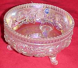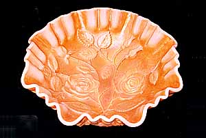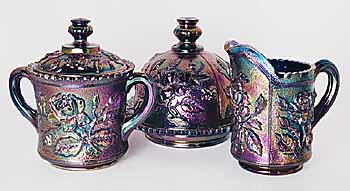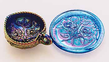 These photos show a potpourri of reproduction Open Rose and Lustre Rose pieces. Top left are bowls in teal (7 3/4 inch) made by Smith and an Imperial (LIG) cobalt (6 1/2 inch) in the shape of a fernery. Top right is a blue three-piece table set (the only way the new sets come) marked ALIG. Table sets are also known in marigold and white. Bottom left is an Open Rose three-in-one edged bowl in marigold on moonstone. It is believed that this was a prototype made for Sears Roebuck and ultimately rejected by them. This shaped bowl in various colors is prbably the most seen reproduction. The small whimsies, bottom right, were purchased at Imperial's company store.