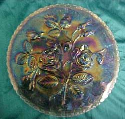 Large Chop Plates, about 10 1/2 inches, were reissued by Imperial in marigold (Rubigold), smoke (Peacock), and pink. |