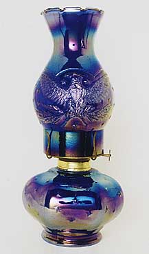 The second photo shows a 12-inch tall oil lamp. Two covered pieces have oblong shaped bowls, while the nappy and the taller goblet compote have a round bowl. All pieces have an american eagle on both the front and the back. Stars fill the background and cover the lids. All are marked with the Smith "S". |
