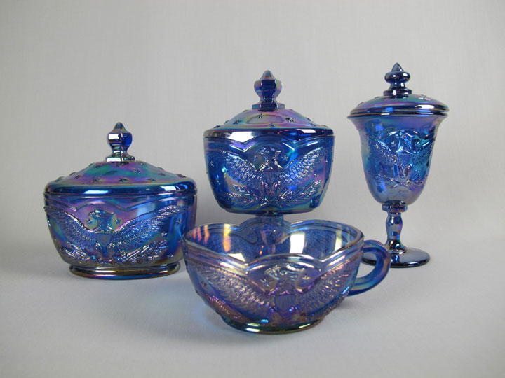 These items were made by L. E. Smith GLass Co. in celebration of the U.S. Bicentennial in 1976. Five items were made in all. They are found iridized in this "Independence Blue" and white. Non-iridized pieces may be found in amberina, green, milk glass and a light blue.