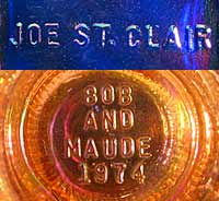 Iridized novelties were a great success in molds such as the Indiana Chieftain, Inverted Fan and Feather, and Holly Band patterns. Joe and his brothers also made handmade paperweights. Joe retired in 1971 and the factory sold. Bob, Ed and nephew Joe Rice left then to help Bob start his own small facility in West Elwood. Bob and his wife Maude continued to make small novelties and marked them "Bob and Maude". They continued to work until Bob's death in 1984. The facilites were then sold to nephew Joe Rice who continues to make art glass. It is this facility in West Elwood that was known as the "Glass House". Visit their website here. Joe St. Clair was not retired long as he bought back his facilites in 1974. Joe continued to work making paperweights and pressed glass until his death in October 1987. Thus St. Clair glass was made throughout the 1970s and 1980s at two facilities in Elwood, Indiana. |