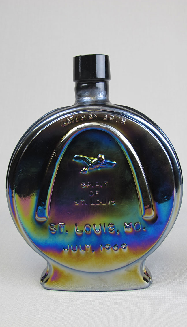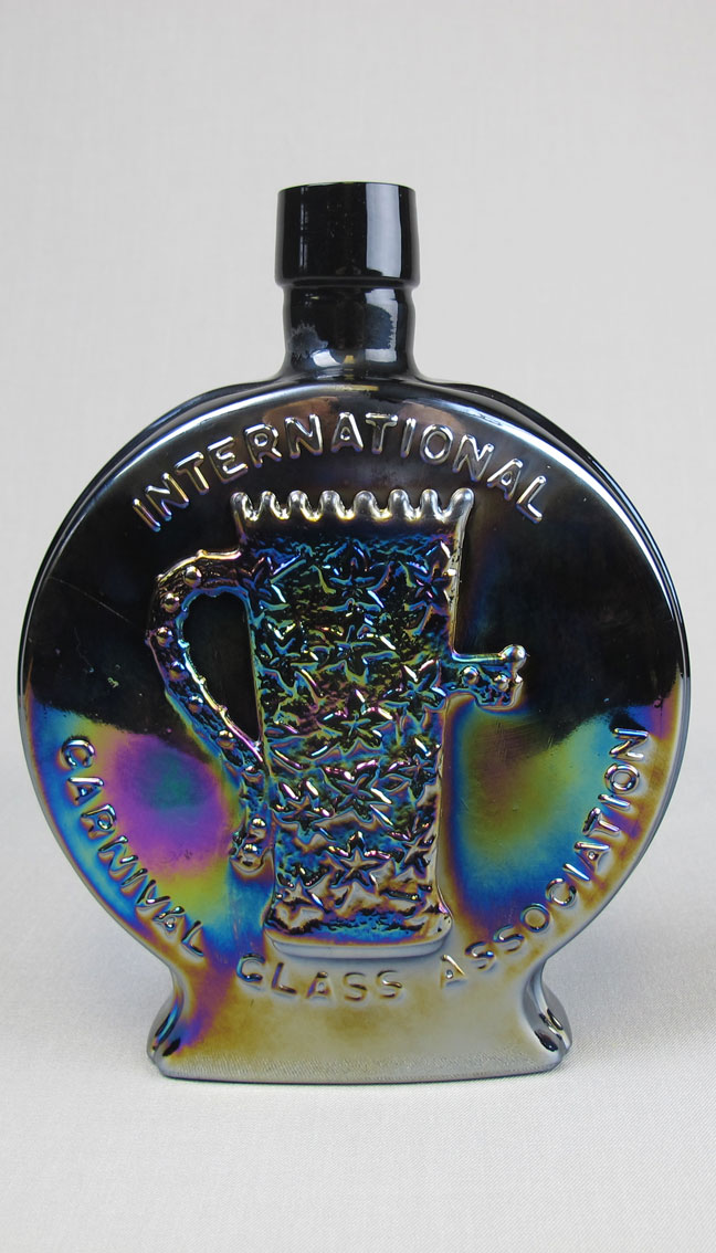 The above bottle was made for ICGA's annual convention souvenir in 1969. The front of the bottle reads "International Carnival Glass Association". The back of the bottle reads "Gateway Arch, Spirit of St. Louis, St. Louis, MO July, 1969". |