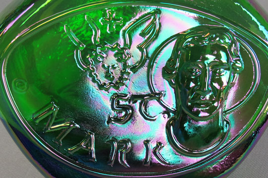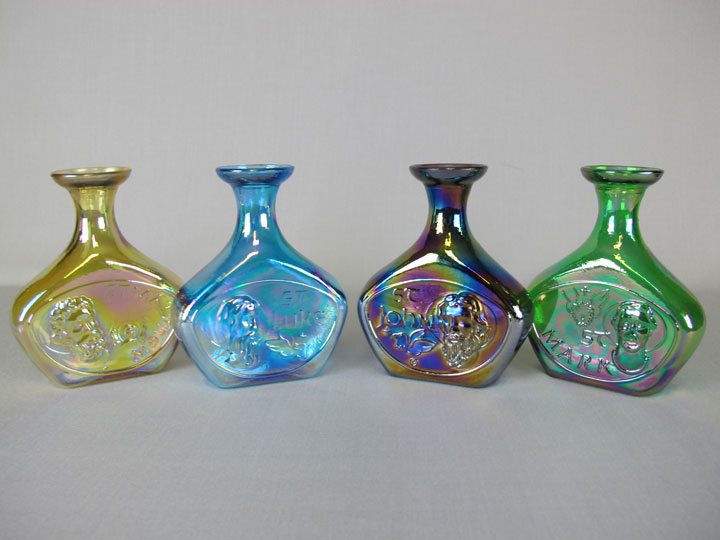 Saint Matthew - Amber glass Saint Luke - Blue glass Saint John - Purple glass Saint Mark - Green glass The bottom of each bottle reads: © W75