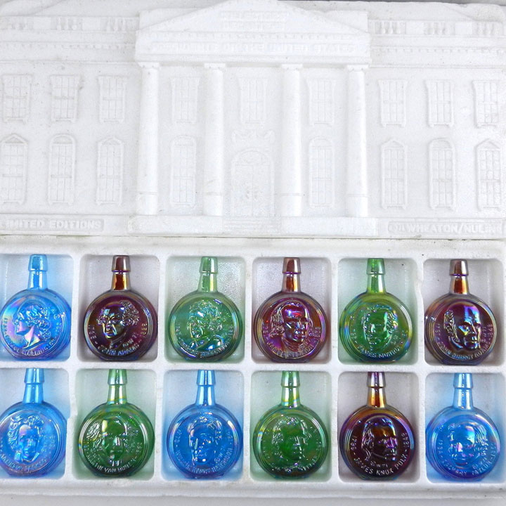 They produced a series of 36 iridized collector mini bottles featuring the then 36 presidents. These came in 3 styrofoam boxes where the lid resembled the White House. These bottles are about 3 1/2 inches tall. They also produced a series of 44 larger, eight inch tall, presidential bottles featuring the first 44 presidents. Only some of these larger presidential bottles are iridized. Often when they produced a series of bottles, they produced a corresponding series of plates or bottles. See the links below. |