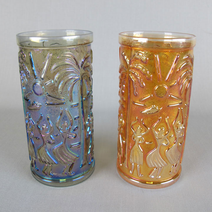 Clock-wise from top left are: "Aloha" which has a design of palm trees and hula dancers; "Colonial Cabin" which has a design of a chair, fireplace and spinning wheel; "Hobnail" and "Bamboo". The Hobnail tumbler is 5 inches tall while the other three patterns are about 5 1/2 inches tall. |