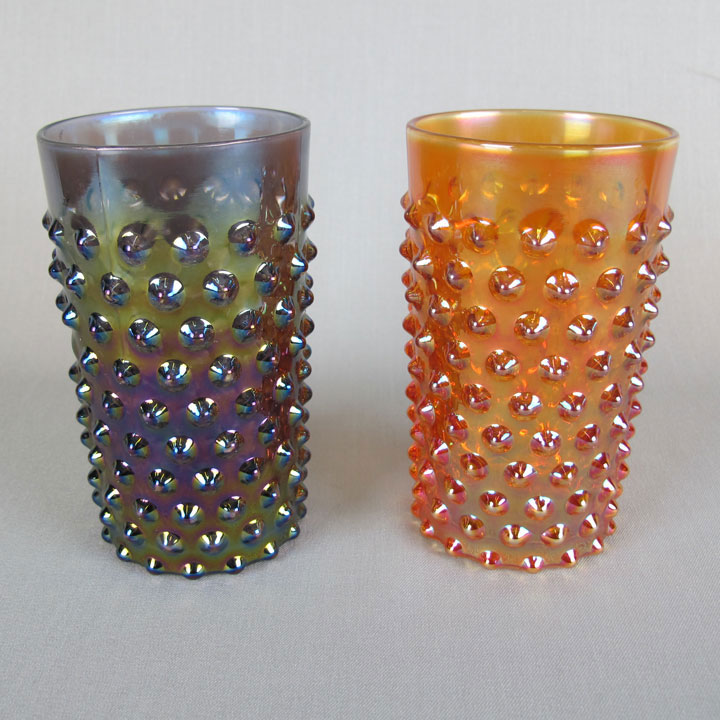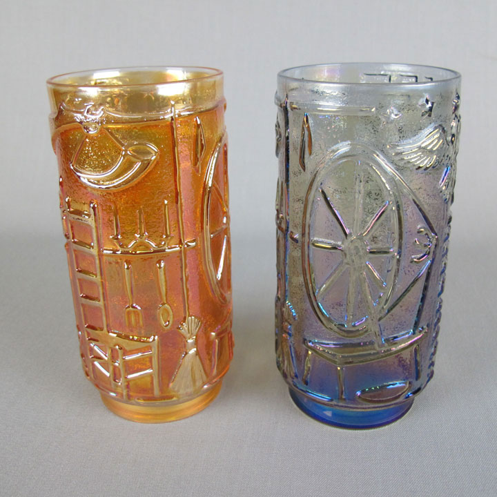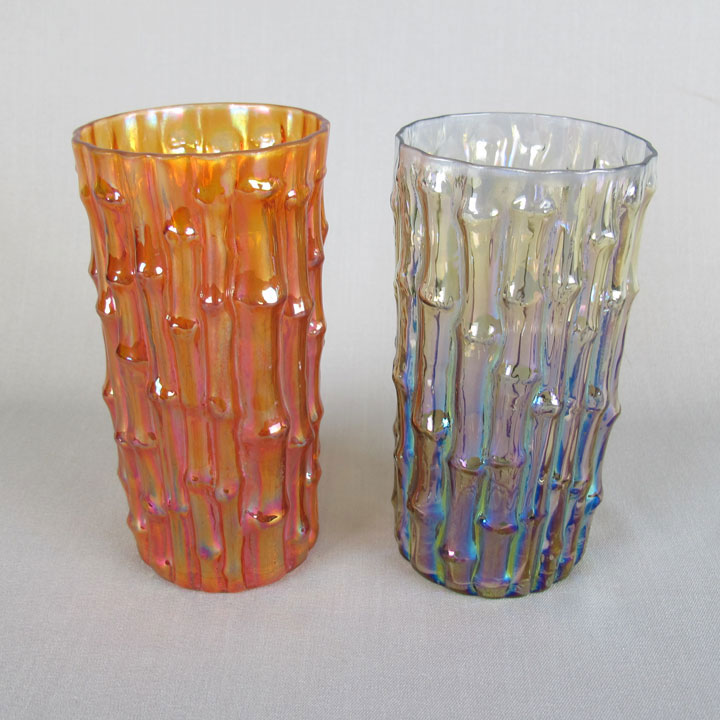 | During the 1960's, Imperial made several contemporary sytle ice tea tumblers. These four were iridized and made in both marigold (Rubigold) and smoke (Peacock). Quite rare.