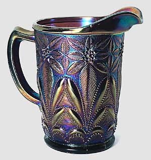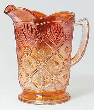 The Beaded Ancanthus milk pitcher, to the left, has an overall pattern of diamonds with daisy-type designs at the intersections and in the center of the stippled diamond background. Although made by Imperial, this pattern is unrelated to their other pattern called Acanthus. This milk pitcher is the only shape known and invariably seen in marigold as shown here, though smoke examples are known.