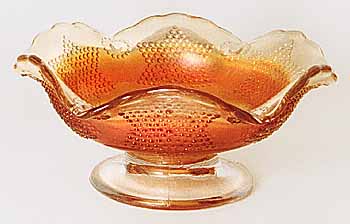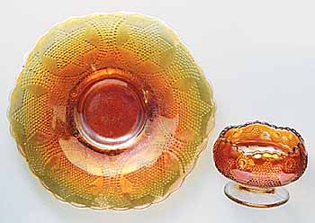 Notice that there are two seperate Beaded Star patterns. Each have the six beaded stars around the piece, but one has only small beaded cirlces between the stars as shown in the photo on the left while the other has the space between the stars completely encircling the stars as shown in the photo at the right. These have become known as "Beaded Stars and Circles" and "Beaded Stars and Swag". Shapes include bowls, small sauces, card trays, 9 inch plates and rosebowls. Always found in marigold. |