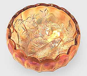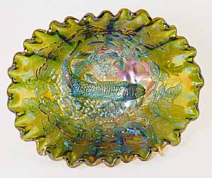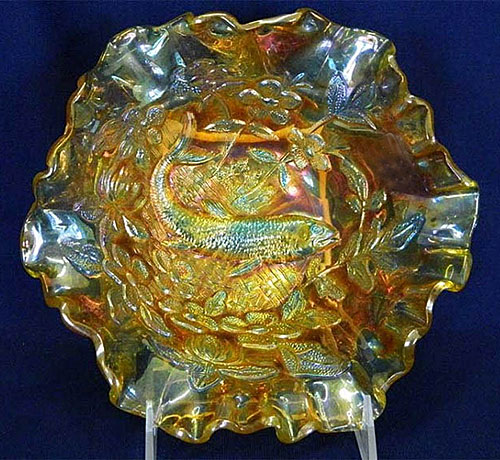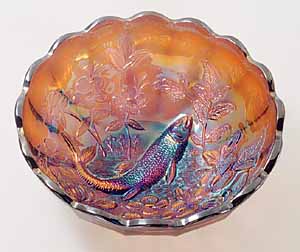 Bowls, 8-9 inches, can be ruffled, ice cream or 3/1 and found in amethyst, green, marigold and vaseline. Millersburg shaped many of its pieces in unusual ways and Big Fish bowls can also be found in diamond, square or tricorner shapes.