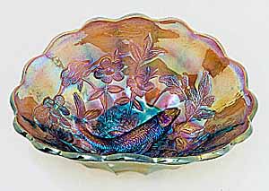 | Big Fish is very similar to Millersburg's Trout and Fly, but without the fly. That's the obvious difference, but a close study of the patterns shows that while the fish are similar, there are differences in the shape and detail. The foliage, while similar and appearing in about the same density, is different in detail. This means that each pattern was made from a different mould. The amethyst Big Fish on the left is the shape as it came out of the mould. It would have been shaped like this before being reheated and then made into other shapes such as the oval and crimped like bowl on the right. Both pieces were photographed while in private collections.