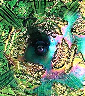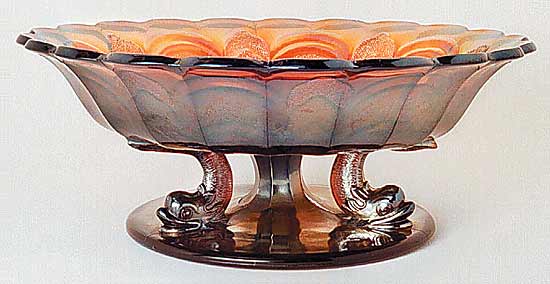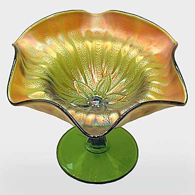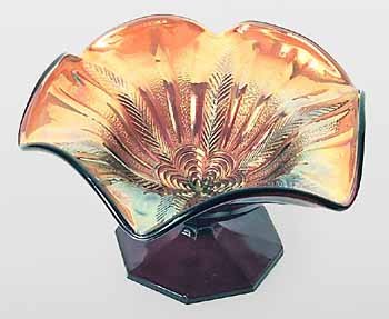Found only in a compote, the peacock tail pattern is more of a medallion in the center--around which radiate feather-shaped rays. While traditionally attributed to Millersburg, not all collectors agree; some think it was made by Dugan. However, colors are typical Millersburg's amethyst, green and marigold. See also Rosalind variant compote. |