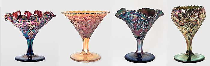 Shown here are just about all shapes found in the Deep Grape compote, and in each of the colors in which Millersburg made them. Far left is a ruffled example in amethyst, then a round flared one in marigold, next a square ruffled in blue, and finally the only known rosebowl shape in the pattern--in green. |