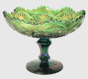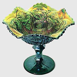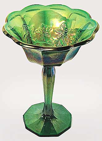 Very few examples of this 9-inch tall Flowering Vine compotes are known; two in amethyst, one in marigold, and this one in green (pictured to the left). A leafy vine encircles the interior center of the compote. The exterior has 9 fluted panels.