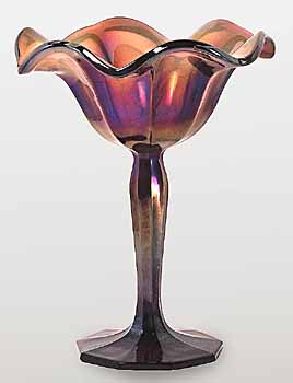 There are four poppies in this pattern--directed toward the center. The back pattern is Millersburg's Potpourri. Poppy is known only in compotes with several edge treatments and flattened out versions called salvers. Colors are amethyst, green and marigold. | ![]() |