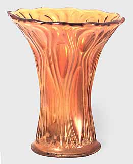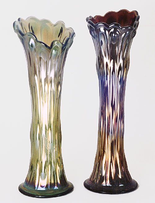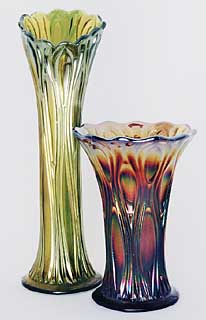 Millersburg's Tulip Scroll is quite scarce. This short marigold example shows the pattern of thumbprint-style indentations well. Heights vary from 6 1/2 inches to about 12; the base diameter is 3 1/2 inches. The green example at the right is 12 inches tall; the amethyst 7 inches. |