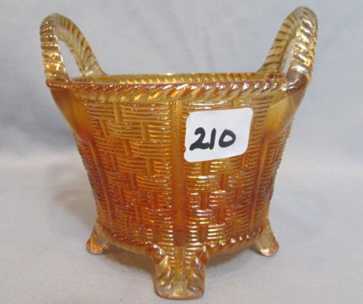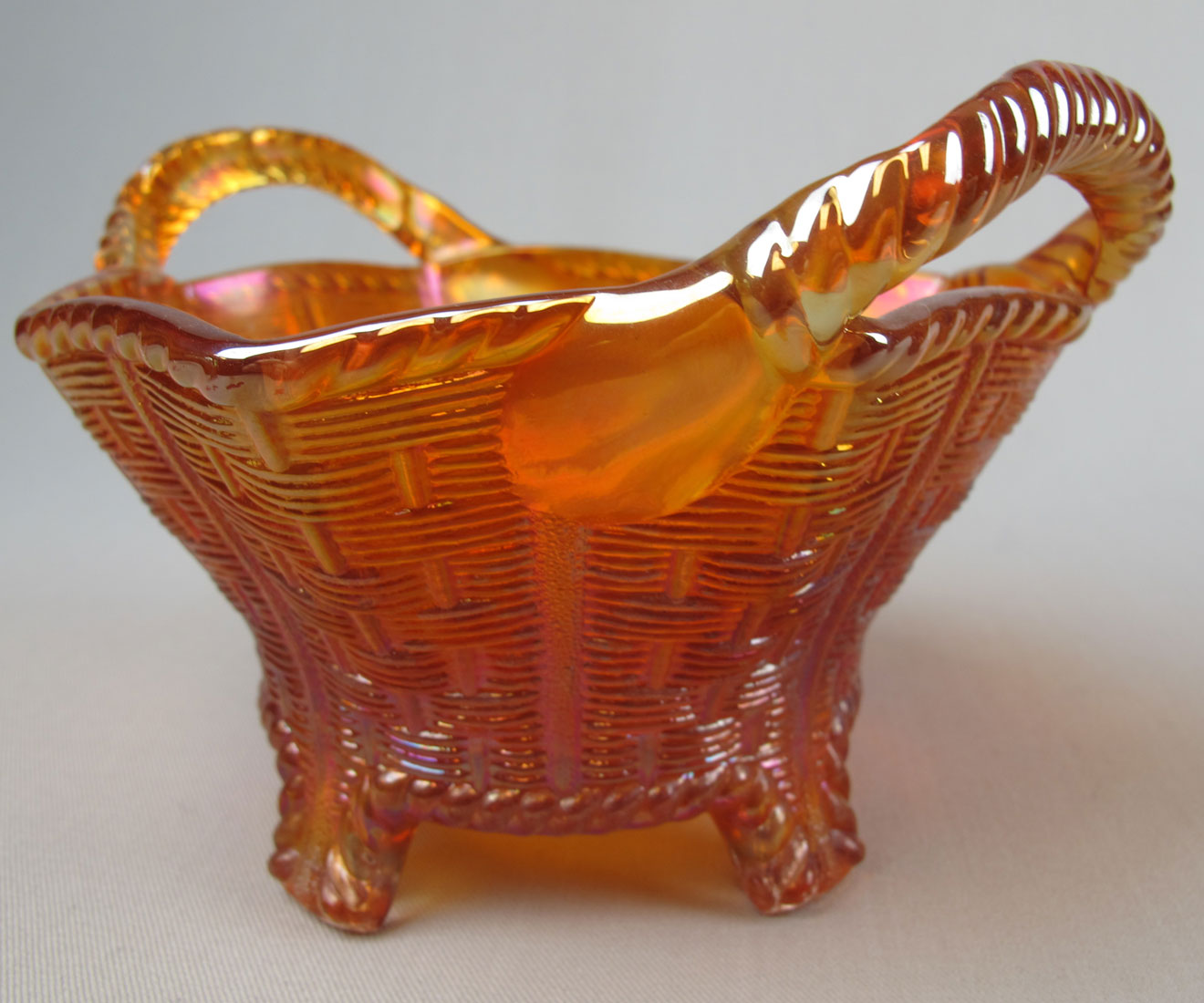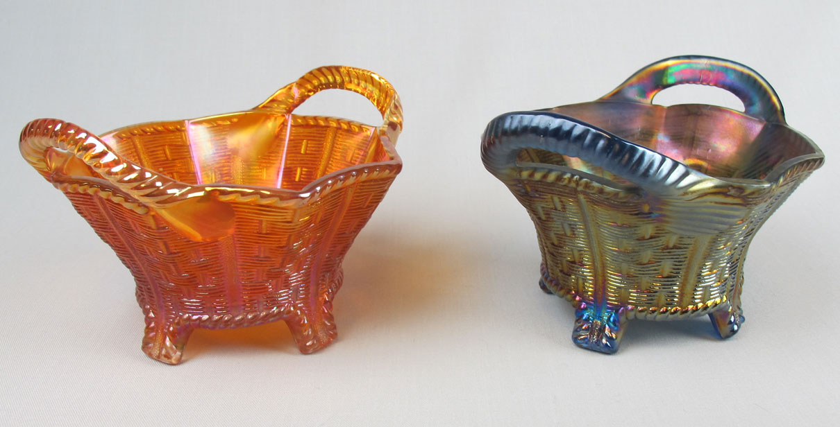 These baskets must have been very popular during the classic Carnival era as there are so many of them around. The baskets, above on the left, are the round baskets and, on the right, are the 8-sided baskets. Rare versions with smooth handles where they connect to the bowl are found in both the round and 8-sided examples. These smooth handle variants seem to only be found in amethyst and marigold.
