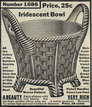 Round baskets are more common than the 8-sided ones. Amethyst, aqua opal, blue, ice green, and marigold are common colors in the round versions, however, iridized round versions come in over 20 different colors. Eight sided baskets come in fewer colors than the round baskets. The 8-sided versions are actually more common than the round versions in ice blue and white. Eight sided verisons are also found in amethyst, blue, green, and marigold. Other colors would be rare. Most would think that the round version and the 8-sided version came from the same mold, but there are differences in the mold work between the two. In the round version there are 39 ribs on the handle while on the 8-sided version there are 41. |
