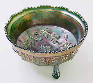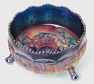 Bowls, all with claw feet, are easily found. Above are a green bowl in the typical round shape and a blue bowl with the sides straight up called a fernery. If these bowls are slightly cupped in, they're referred to a rosebowls. If the bowls are widely spread into an ice cream shape, they're called centerpiece bowls, such as the one pictured to the right. Smaller bowls were also made and would make a berry set when six were paired with a large bowl. Large bowls may also be ruffled and small bowls are typically round as shown in the picture to the right. Typical colors include amethyst, blue, green and marigold. Rare colors would be Nile Green, teal and white. Small berry bowls are also known in red. Imported fake bowls are known in white and amethyst. |