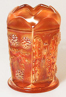 Tumblers were reissued in amethyst by Fenton in the 1970s. Fenton's Butterfly and Berry also comes in a four piece table set including a covered sugar, a spooner, a creamer and a covered butter dish. Note that all the pieces of the table set have the claw and ball feet. Table sets are found mostly in marigold but are also known in amethyst, blue and green. |