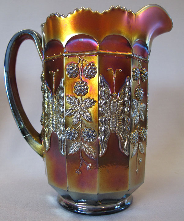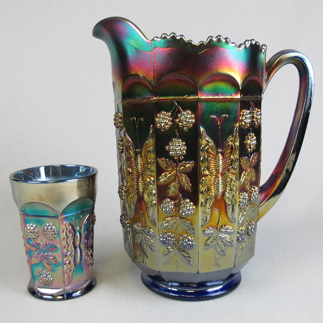Fenton' Butterfly and Berry water and sets are found mostly in blue and Marigold, however, amethyst and green are also known. At left is the typical water pitcher and tumbler found. But in the center is a variant water pitcher that has fewer berries and leaves towards the bottom part of the pitcher. Note that there is no leaf below the butterfly as in the standard version. This variant pitcher is in amethyst.