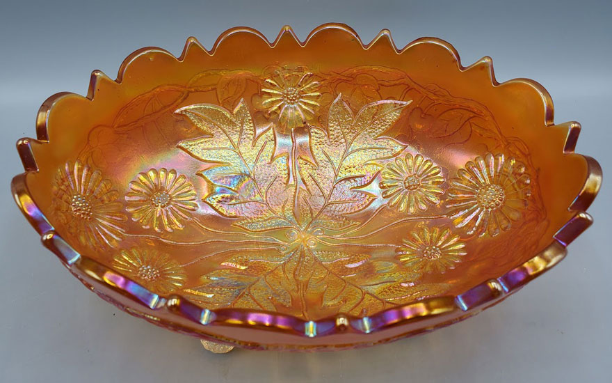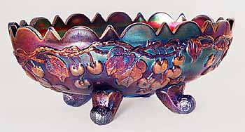 This pattern is similar to Millersburg's Hanging Cherries but it was in fact made by Fenton. Only known in the 9 1/2 inch banana boats shown here and very rare. There are several blue examples and one marigold example known.