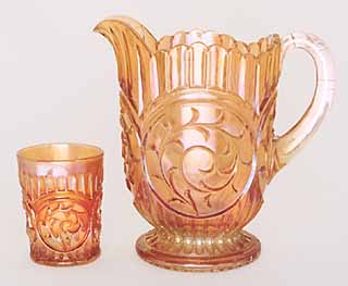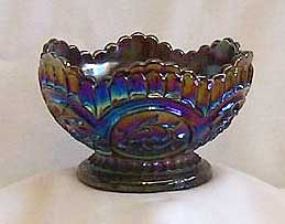 Recognized by its large circular panel with a scroll design inside, Circle Scroll is found in a limited number of shapes, many of which are rare. The most often seen shape is the hat, usually jack-in-the-pulpit, 2 sides up, tricorner, or ruffled. All hats are made from the tumbler. Surprisingly, the tumbler itself is quite scarce. Pitchers are rare. Bowls and berry sets are also quite scarce, but seldom bring much money. The large amethyst bowl is one of the few known. Although table set pieces are known, they rarely come up for sale. Above is an amethyst small bowl from the collection of Larry Keig. |