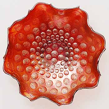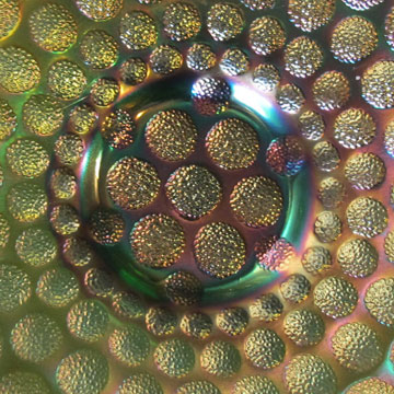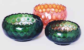 The photo in the center shows the Coin Dot Variant as it has six smaller dots around the center six large dots. It also appears to have more space between the six center dots and the first row of dots around those six center dots. All rosebowls, whether with stippled or plain dots, are thought to be Fenton's Coin Dot. Rosebowls are available in amethyst, aqua, green, lime green, marigold, olive and celeste blue. Plates, about 8 inches, are known in marigold. 7 to 9 inch bowls are known in amethyst, aqua, blue, green, lavender, lime green, marigold, peach opal, red and vaseline. |