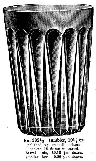 | Slightly taller than the average tumbler, this tumbler is only found in purple. No pitchers or other shapes are known coming from a mold with a designation of No. 382. The catalog picture comes from the 1909 Imperial Glass Company catalog. These are quite rare. | |