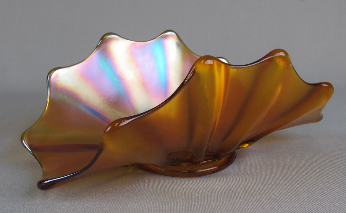 Although this vase has prominent vertical ribs like several other patterns, it's the only one with 12 ribs. The base diameter is 3 1/4 inches. The vases were made from the same mold that is sometimes seen flattened into a bowl, plate, or banana dish.