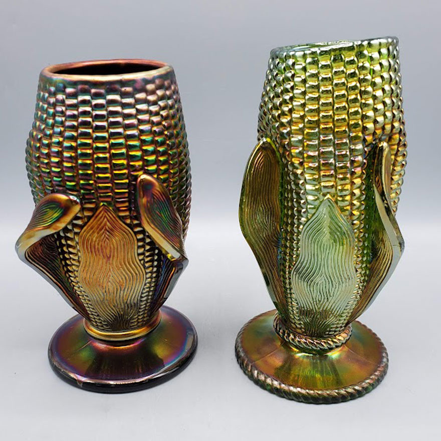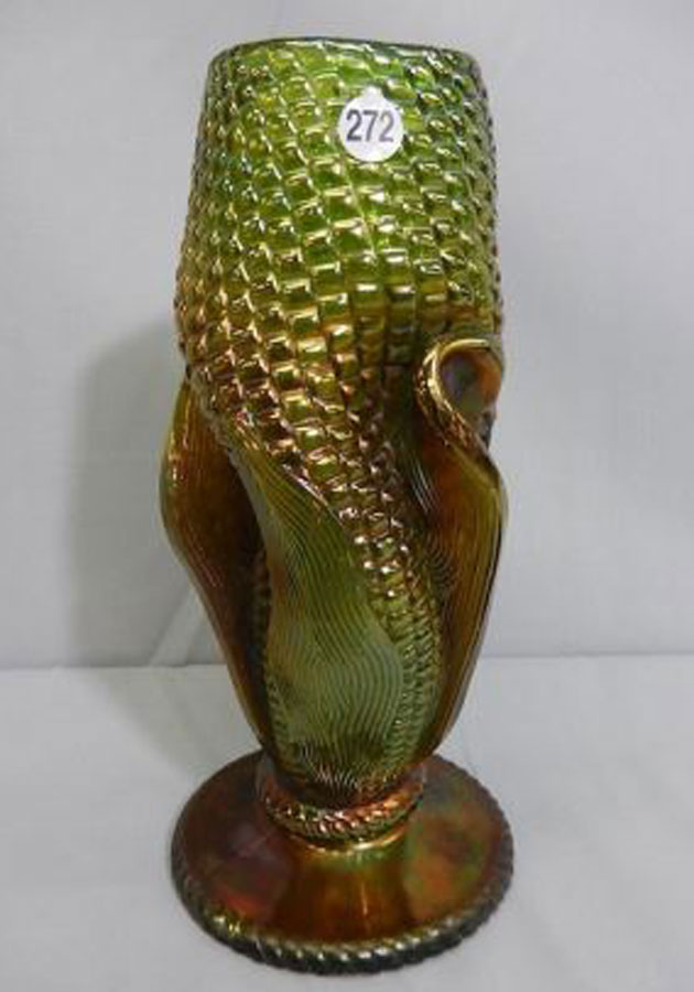 Pulled Husk vases are named as such because when the vase comes out of the mold, the "husks" on the sides can be pulled or otherwise shaped before the glass sets. The three vases above each exhibit unique husk shaping. There are about 12 of these vases known. Most are found in amethyst but green vases are also known (see green vase to the right). The heights range from 7 to 8 inches depending on the shaping of the top as some may be cupped in such as the vase in the center above.