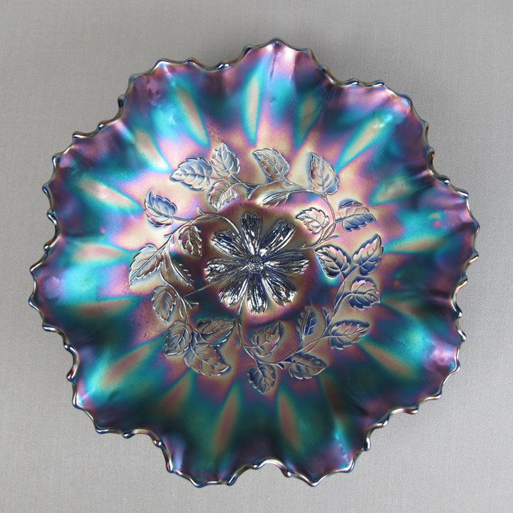 This pattern has the flower in the middle with a wreath of leaves around it. Unlike the Millersburg Cosmos pattern, which is found only in green bowls 6 to 7 inches across, this one is found mostly in 8 1/2 or 9 1/2 inch bowls and occasional chop plates flattened from the larger bowls. All pieces have a sawtooth edge.