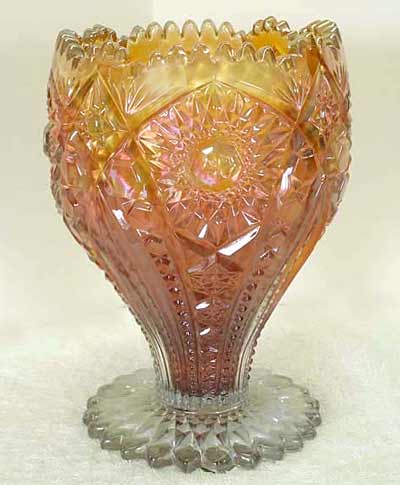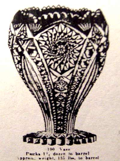 The center photo is a flared marigold example. In 2008, Paul Kirk sent in this scan from an undated Lancaster Glass Company catalog. It appears to be the same pattern and is called "100 Vase". |