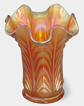 This Drapery vase is easily mistaken for a Boggy Bayou. This vase was created from the same mold used for the bowls above. There are opalescent, non-iridized examples of this vase, but only a very few known carnival examples, all marigold.
