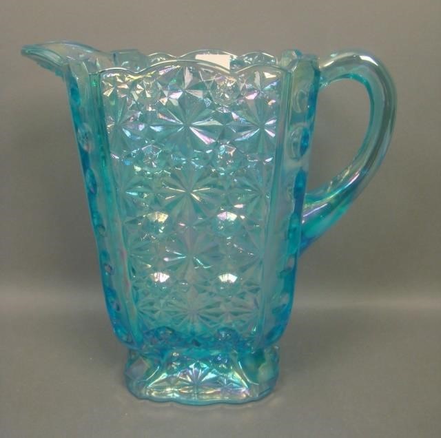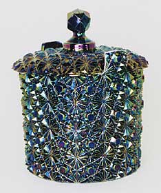 This is Fenton's design with a slotted lid that fits over two projections on the lid. The next two photos are a covered jar and a covered compote by Smith. The final picture to the right is a water pitcher in ice blue. |