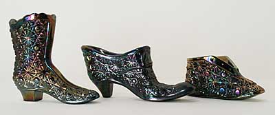 Quite a variety of boots, shoes and slippers in the Daisy and Button pattern. The first one was made by Fenton although several makers make similar pieces. The bootie on the right is part of Fenton's OVG line. |