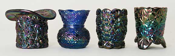 Toothpick holders are found in a wide variety of shapes. The first one, the top hat, is from Fenton's OVG series, though Boyd makes a similar item. The others are from several makers.