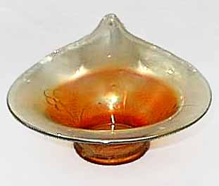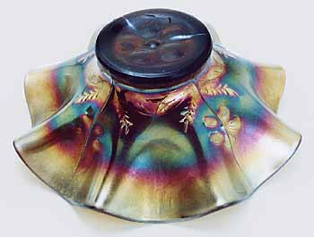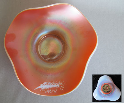 Daisy Dear and Triplets are very similar patterns: Daisy Dear has four flowers with leaves around the exterior while Triplets has three. Shown above are a purple Daisy Dear ruffled bowl and a marigold jack-in-the-pulpit shape. To the left is a peach opal tri-ruffled bowl showing its plain interior. But it is marked 1909.