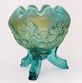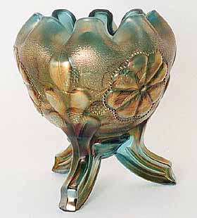On the left is one of a handful of known Daisy and Plume footed rosebowls in aqua opal. It sold for $17,000 in 1997. On the right is one of the Dugan versions of this pattern. Peach opal examples will be Dugan. |