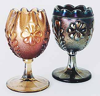Daisy and Plume is found in two versions; the three footed as shown on the left, and the stemmed as shown on the right. The three-footed version may have a plain interior, a rayed interior, or a berry interior; the stemmed a plain or fern-type interior. The berry interior pieces are more desirable than the others. In additon, each version is cupped in to form a rosebowl or may be spread out to make what's called a candy dish in the three-footed version or a compote in the stemmed version. The stemmed version also has two variations; one with a plain top as shown in the amber example above or with a band as shown in the purple example. |