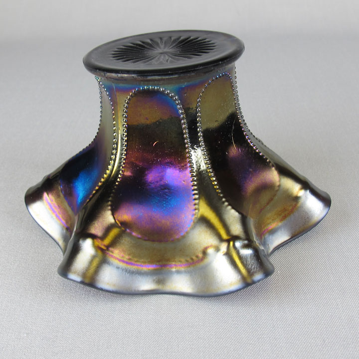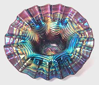 Dugan's Daisy Web hat (some call it a basket) is a rarely seen pattern. It is characterized by a web design on the interior with a daisy in the bottom. The above left photo is a crimped jack-in-the-pulpit example, one of the best known. The marigold example on the right is six ruffled. Tri-corner crimped and two sides up are other known shaping. Only found in marigold and purple.