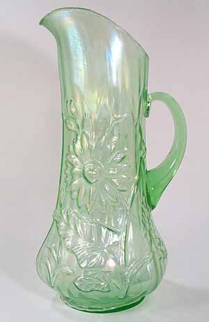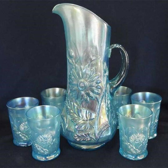 Shown above is the standard Dandelion tumbler: a variant, which sells for about the same price, has vertical ribs on the interior and is found in amethyst, ice blue, ice green and white. Pitchers are the tankard type. Pictured here are a tumbler in horehound; a green and ice green pitcher; as well as; full water sets in amethyst and ice blue. Other colors include marigold and white. Individual tumblers may be found in other colors. Also see Dandelion Mugs. |