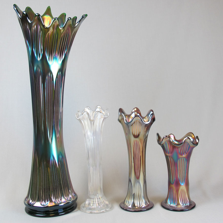 Diamond and Rib vases can be found in two sizes, standard and funeral. There are actually two different moulds for the standard size, with base diameters ranging from 3 to 3 1/2 inches. One mold has three rings of ribbed ovals and the other has four rings. Heights for all standard size Diamond and Ribs range from about 6 to about 13 inches. In the center photo is a squatty Diamond and Rib vase to clearly show the pattern prior to it being swung. The photo to the right shows a white Diamond and Rib vase wioth four rows of ribbed ovals. The four are difficult to see as the vase is quite swung. These four rows vases are typically found in white. The funeral has a base diameter of 5 1/4 inches and a height range of 17 to more than 21 inches. Diamond and Rib vases have been reproduced. |