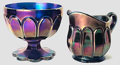 | Northwood's Double Loop is sometimes referred to as Colonial. Shown are an open sugar (sometimes called a chalice), and a creamer. Sugar bowls are known in aqua opal, blue, green, purple and marigold and creamers are rare and found only in blue. Because of the differences in the pattern, the sugar has a scalloped base while the creamer has a round base, some believe these were never sold as a set. | |