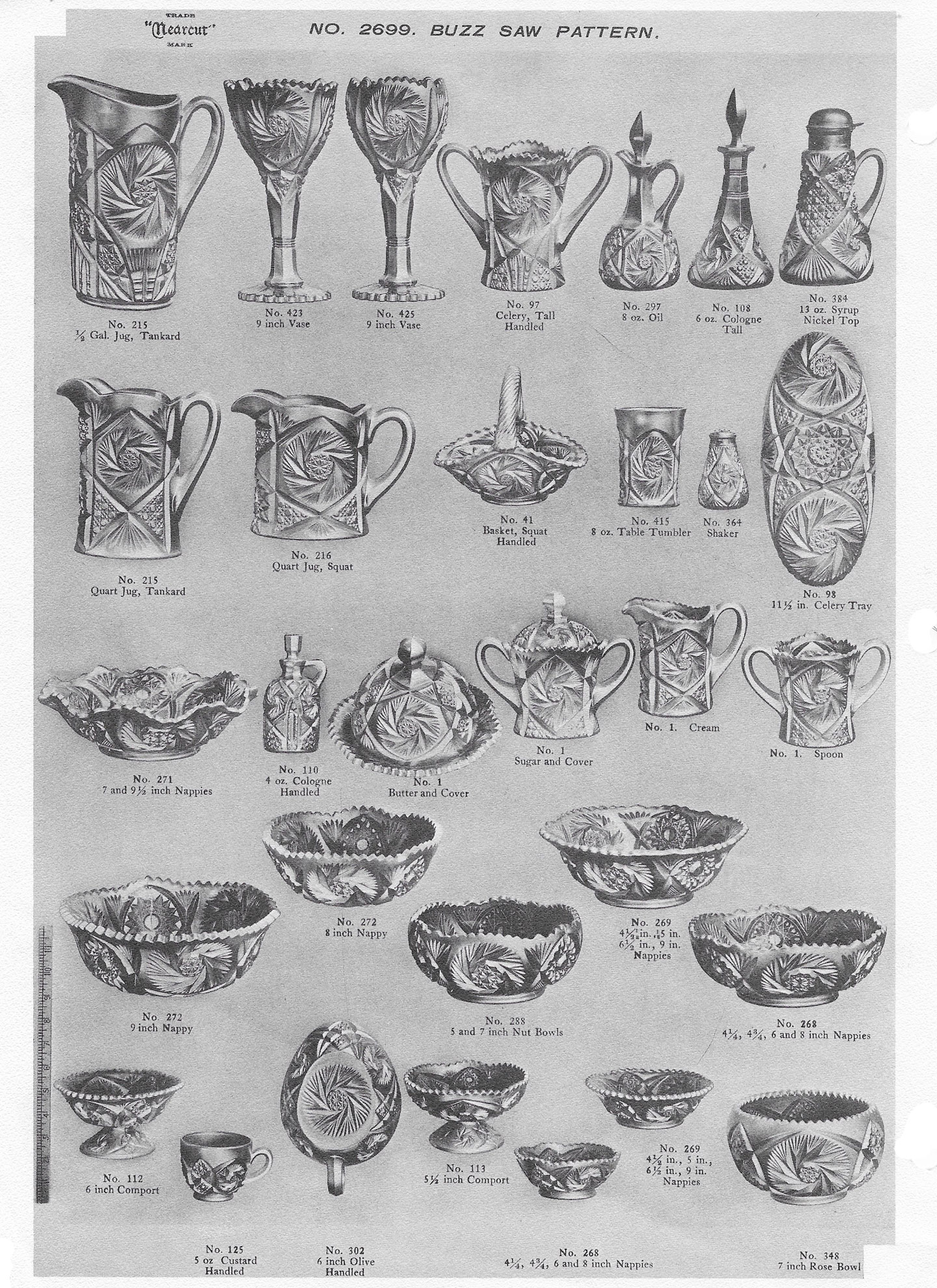 Although both the water set and the cruets appear in one catalog page from Cambridge, carnival glass collectors refer to the pattern on the cruets as Buzz Saw and the pattern on the water set as Double Star. |